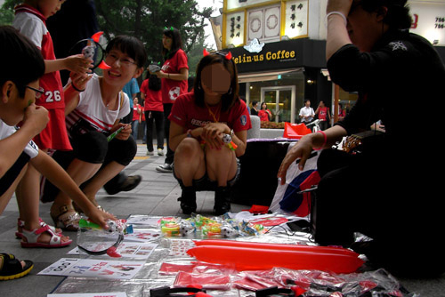 박영미(가명·24) 씨도 마찬가지였다. 막대 풍선 1000원, 붉은 악마 뿔 2000원, 응원 스티커 1500원. 없는 거 빼고 있는 건 다 팔고 있었다. 남편과 같이 나온 박 씨는 "아직 개시도 하지 못했다"며 "사람들이 구경은 많이 하는데 선뜻 사질 않는다"고 한 숨을 내쉬었다.