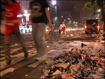 | ▲ 응원이 끝난 후 시청역 인근 모습. 응원은 달콤했을지 몰라도 쓰레기가 넘쳐나는 거리의 뒤끝은 씁쓸하기 짝이 없다. ⓒ프레시안 |