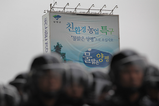 | ▲ 지난 5월 경기도 양평군 양서면 두물머리에 투입된 경찰 병력. 뒤로 '친환경 농업 특구'라고 쓰인 홍보물이 보인다. ⓒ프레시안(최형락) |