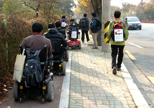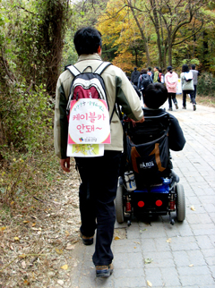 '교통약자의 접근권'은 처음부터 삐걱거렸다. 3호선 구파발역에 모여 출발한 일행은 1시간 20분을 꼬박 걸어서야 북한산성 입구에 도착할 수 있었다. 저상버스가 운행 중이라고 하지만 한창 탑승객이 붐비는 시간엔 전동휠체어를 탄 장애인이 이용하기가 녹록치 않은 일이고, 여기에 장애인 전용 콜벤을 부를 형편이 여의치 않을 경우 산에 도착하기도 전에 기나긴 '대장정'을 할 수밖에 없는 상황인 것.
