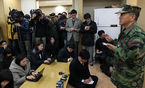 | ▲ 24일 오후 전사한 해병대 서정우 하사와 문광욱 일병의 합동 분향소가 설치된 경기도 성남 국군수도병원에 해병대 김태은 정훈공보실장이 포격 당시 상황을 설명하고 있다. ⓒ연합뉴스 |