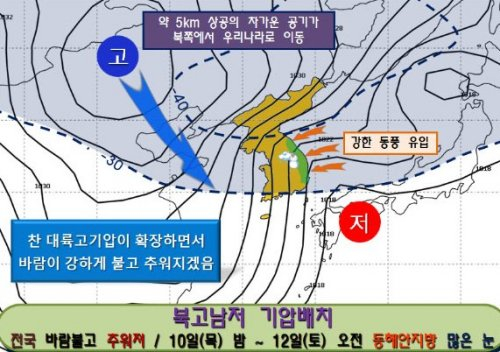 기상청 관계자는 "상층 5km에 영하 30도 안팎의 찬 공기가 머무르는 가운데 우리나라 북쪽에 찬 대륙고기압이 위치하고 일본 열도를 따라 저기압이 지나는 북고남저형의 기압 배치가 이뤄졌다"고 말했다.