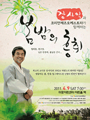 ▶2011. 4. 9(토)/ 마포아트센터 아트홀 맥 생동하는 봄, 한층 업그레이드된 신명의 한판이 펼쳐진다. 최고의 소리꾼 장사익과 30인조 빅밴드의 화려한 어울림이 관객들을 찾는다. 장사익은 애절하고도 호소력 짙은 목소리로 삶을 노래하고 애환을 위로하는 대한민국 대표 소리꾼이다. 그가 박력 있는 하모니로 좌중을 아우르는 열정의 코리안재즈오케스트라와 만나 고품격 콘서트를 선보인다. 이번 공연에서는 허허바다, 꿈꾸는 세상을 비롯한 7장의 음반과 소리판 콘서트 꽃구경, 역 등으로 중 장년층의 슈퍼스타로 자리매김한 소리꾼 장사익의 화려한 무대가 펼쳐질 예정이다.
