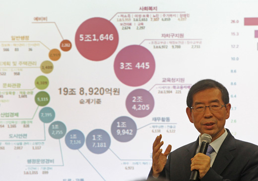 서울시는 10일 서울 중구 시청별관에서 기자회견을 열고 이 같은 내용이 포함된 '2012년 예산안을 확정, 서울시의회에 승인 요청했다고 밝혔다. 이날 예산안 브리핑은 박원순 서울시장이 파워포인트를 이용해 50여분 동안 직접 진행했다. 오세훈 전 시장에게서는 볼 수 없었던 이례적인 행보다.