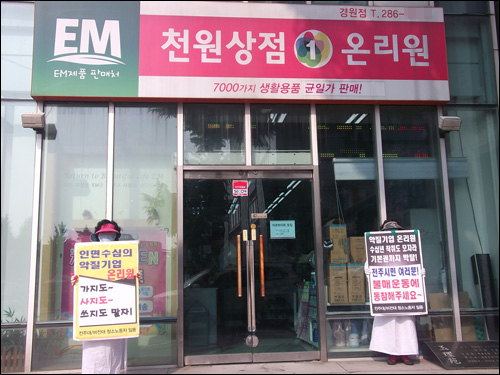 | ▲ 전주오거리 부근에 위치한 천원상점 온리원 매장 앞에서 일인시위 중인 여성노동자들. ⓒ연정 |