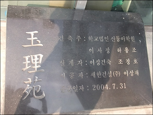 | ▲ 전주오거리 온리원 매장 앞에 있는 표지석으로, 건축주가 신동아학원임이 표기되어 있다. ⓒ연정 |