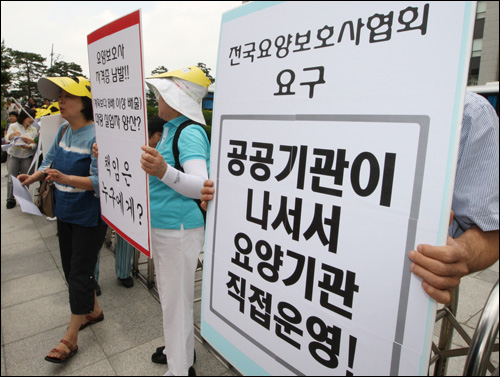 | ▲ 노인장기요양보험제도 실시 1주년인 2009년 7월 1일, 보건복지부 앞에서 전국요양보호사협회 주최로 열린 '요양제도 시행 1년' 기자회견에서 참가자들이 요양서비스 질 개선과 요양보호사 인력 확충 문제 등을 제기하고 있다. ⓒ연합뉴스 |