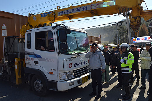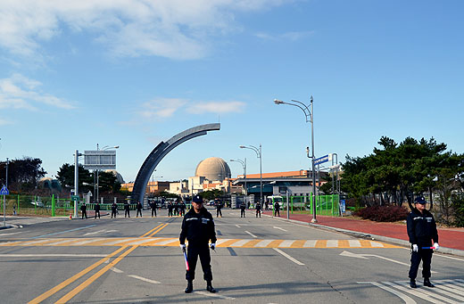 | ▲ 원전 정문 앞에 컨테이너를 설치하려 차량이 진입하자 경찰이 이를 막았다. ⓒ프레시안(허환주) |