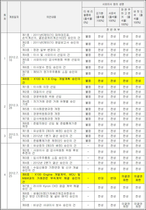 아니, 사외이사들은 2월에는 찬성해놓고 7월에는 왜 모두 반대했을까? 이들은 쌍용차의 신차 개발을 원하지 않는단 말인가? 이 안건을 제외한 다른 모든 안건에서, 사외이사는 물론이고 사내이사들 모두 단 한 차례의 '반대' 표도 행사해본 적이 없다. 유독 이 안건에만 반대 의사를 밝힌 것이다. 물론 정보가 제한되어 있는 나로서는 그 이유를 정확히 알 수가 없다. 이 자료를 토대로 독해를 시도해볼밖에.