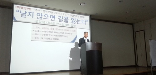 김 교수는 5일 수원대학교 국토미래연구소의 주최로 열린 특강에서 "한국은 7~8년 째 1인당 국민소득이 2만 달러 수준에 머무르며 선진국 문턱을 못 넘는 '문지방 국가' 상태를 지속하고 있다. 앞으로 4~5년 내에 날지 못하면 길을 잃고 말 것"이라면서 박근혜 정부와 6월 정기국회를 열고 있는 국회를 향해 경제 정책 과제를 제시했다.