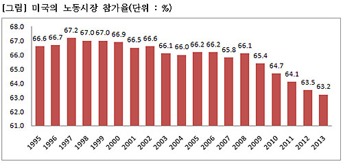 ⇨ 미국 노동통계국의 자료를 보면 글로벌 금융 위기 이후 노동시장 참가율이 급락했다는 것을 확인할 수 있습니다. 노동시장 참가율이라는 것은 15세 이상 인구 중에서 취업자와 1주일 이상 구직 활동을 한 사람들의 비율을 말하는데요. 이 지표는 2008년 66.1%(8월 기준, 이하 동일)였으나, 글로벌 금융 위기 이후 지속적으로 떨어져 2010년에는 64.7%를 기록했고 지난달에는 63.2%를 기록했습니다.