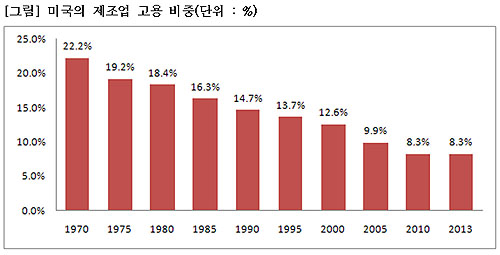 ⇨ 2000년대 중반 국내 일부 학자들은 '제조업 시대는 갔고 이제는 금융업 시대'라는 황당한 주장을 하기도 했습니다. 그러나 앞으로는 그런 어이없는 주장을 해서도 안 되고, 또 그런 주장을 믿어서도 안 됩니다. 제조업의 토대가 빈약한 상태에서 어떤 금융업도 제대로 성장할 수 없습니다. 1980년대 이후 금융자본의 꼬임에 속아 제조업을 소홀히 한 국가치고 금융 위기를 겪지 않은 나라가 없습니다. 지금부터라도 중소제조업 성장을 도와줄 제대로 된 국가 정책을 펴야 합니다. 그런데 지금 정치권을 보면 중소기업 정책에 대한 별다른 문제의식도 없고 대안도 없습니다. 경제 민주화와 복지 정책이 중요하다는 이유로 중소제조업 정책을 소홀히 하면 우리나라도 미국과 같은 추락의 길을 걷게 될 겁니다.