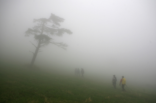 안개는 여전히 짙었다. 끝나지 않는 안개의 숲을 지나는 것 같았다. 안개 속에 나무 세 그루 나란히 서 있었다. 가까운 듯 먼 듯 아스라하기만 했다. 소황병산(小黃柄山, 1430m)을 지났다. 산봉우리라고 할 것도 없이 끝없이 초지가 이어져 있었다. 바람 불어 안개를 밀어낼 때마다 초지는 이어져 있었다. 초지 사이로 한 사람 지날만한 길이 나 있었다. 길에도 풀이 자라 잘 구분이 되지 않았지만 분명히 길이 있었다. 길을 따라 갔다. 길가에 구절초 가득했다. 안개에 취했던 탓일까. 걸으면서 졸았다.