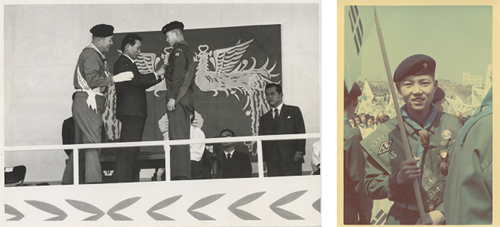 | ▲ 1971년 4월 5일, 매년 한 명을 뽑는 명예 보이스카웃 상을 받는 정병호. 박정희 대통령이 직접 메달을 수여하고 있다(왼쪽). 거리행진 선두에 선 정병호(오른쪽). |