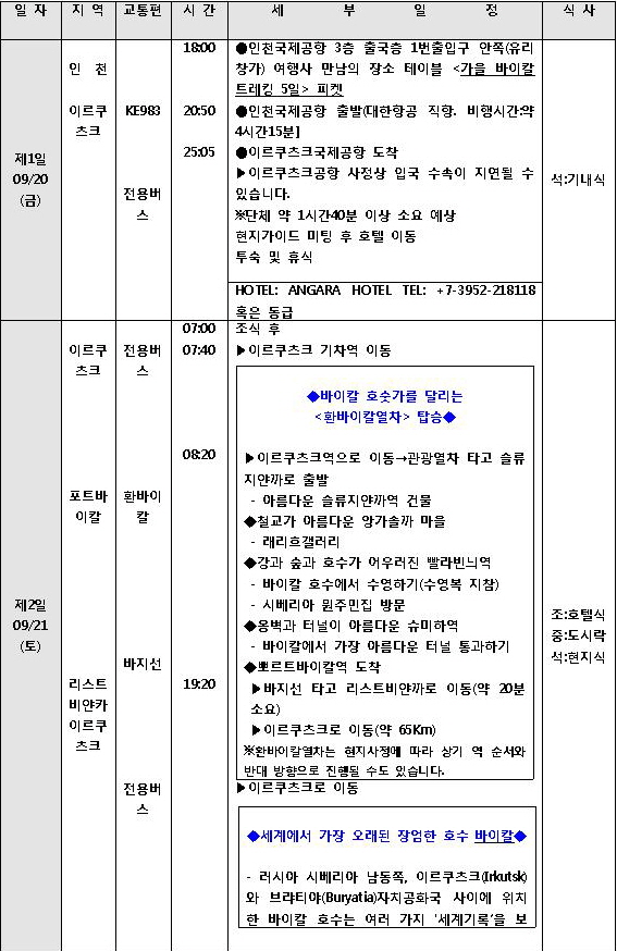 이번 바이칼 환상 체험은 추석 다음날인 9월 20일(금)부터 24일(화)까지 4박5일이며 참가비는 20명 기준 176만원입니다(모든 여행경비 포함하되 유류할증료와 러시아비자발급수수료 제외). 자세한 내용 문의와 참가신청은 (주)마중여행사 02-730-2270 정상준 담당자(judy4@naver.com), 빠른답변은 010-3351-6738 김창원 본부장(kimcwman@naver.com)에게 연락바랍니다. 이번 바이칼 답사는 (주)마중여행사가 진행하고 인문학습원이 후원합니다.