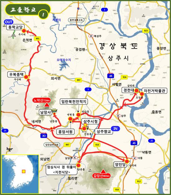 이날 답사 코스는 서울(07:00)→제1강 여는 모임(버스 안)→남상주IC→상주향교(10:00-10:20)→흥암서원(10:30-10:40)→임란북천전적지(10:50-11:10)→경천대(11:30-12:10)→자전거박물관(12:20-12:40)→점심식사 겸 뒤풀이(13:00-14:00. <지천식당>에서 막걸리를 곁들인 고추장석쇠구이요리)→양진당(14:10-14:30)→남장사(15:00-15:30)→우복종택(15:50-16:10)→동학교당(16:30-17:00)→ 화서IC→제1강 마무리모임(버스 안)→서울(20:00 예정)입니다.