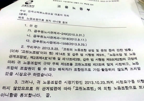 | ▲ 고용노동부가 24일 전교조에 보낸 '노조 아님' 통보 . ⓒ전국교직원노동조합 |
