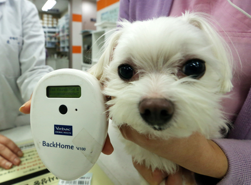| ▲반려견에 내장형 전자칩을 시술한 뒤 리더기로 고유번호를 인식하는 모습. ⓒ연합뉴스 |