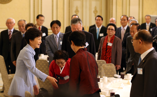 | ▲ 박근혜 대통령이 지난 9월 27일 청와대 영빈관에서 열린 노인의 날 기념 전국 어르신 초청 오찬 행사에 입장한 뒤 참석자들에게 자리를 권하고 있다. ⓒ연합뉴스 |