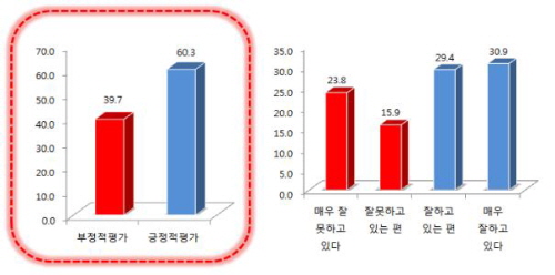 구체적으로는 '매우 잘 하고 있다'는 응답이 31.0%, '잘 하고 있는 편'이라는 답이 29.4%였고, '잘못하고 있는 편'이 13.9%, '매우 잘못하고 있다'가 25.8%였다.