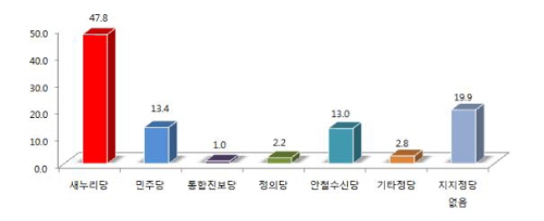 이번 조사의 정당지지율 조사에서는 '안철수 신당'의 영향력이 주목을 끌었다. 기존 정당지지율 조사에 '안철수 신당'을 포함시켜본 결과 새누리당 47.8%, 민주당 13.4%, 안철수 신당 13.0%, 지지 정당 없음 19.9%라는 결과가 나왔다.