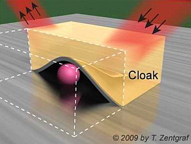 박규환 : 맞아요. 비행기, 헬리콥터 사고 또 일상적으로는 새도 위험해지겠죠. 아무튼 이게 투명 망토의 가장 썰렁한 버전입니다. (웃음) 또 다른 투명 망토는 버클리 대학에서 개발한 것인데요. 이건 투명 망토라기보다는 일본 닌자의 위장술 같은 겁니다. 그러니까 한쪽 벽에 숨기고 싶은 물체를 놓고서 그 위를 카펫으로 덮는 거죠. 그래서 이런 투명 망토를 '카펫 망토(carpet cloak)'라고 부르죠.