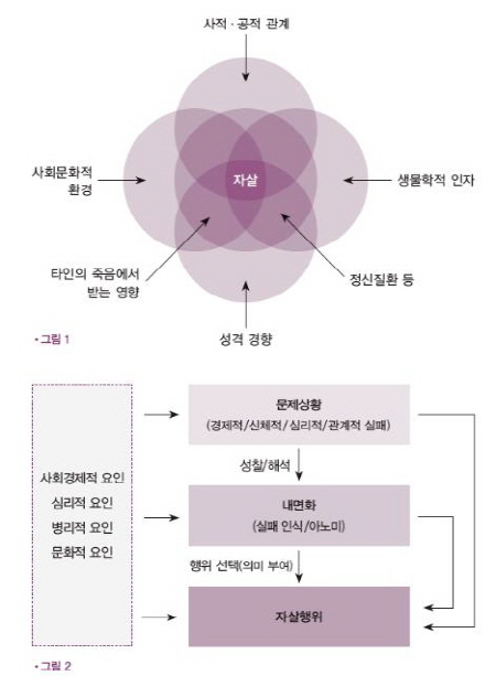 위의 도표는 각각 자살을 야기하는 복합적인 '문제 상황'과(그림1), 자살행동 과정을 설명하기 위한 것(그림2)으로, 다카하시 요시토모의 <고독의 병: 자살의 심리학>(변은숙 옮김, 알마 펴냄)과 박형민의 <자살, 차악의 선택>(이학사 펴냄)에 나오는 도표를 재구성하고 변용한 것입니다.