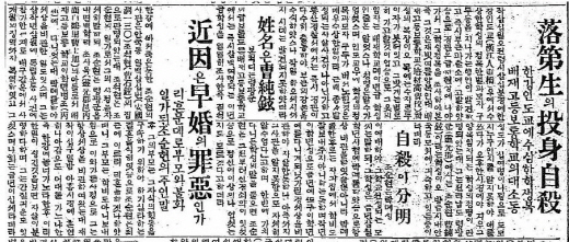 어쨌든 <동아일보>는 그 주변을 추적해서 이틀에 걸친 상당히 긴 기사를 썼는데요. 처음 뽑은 큰 표제는 "낙제생의 투신자살"이었습니다. 즉 고등보통학생이 낙제를 했다는 사실, 그것을 자살의 원인으로 의미화한 것이지요. 그리고 중간 제목에 "자살이 분명"이라고 나와 있죠. "성명은 조순현", 또 "근인(近因)은 조혼의 죄악인가"라는 중제도 있습니다.