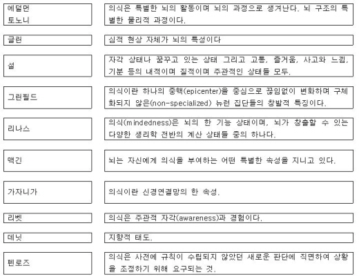 이 책에 등장한 신경과학자들의 의식에 대한 의견을 한 줄로 요약하면 아래와 같다.