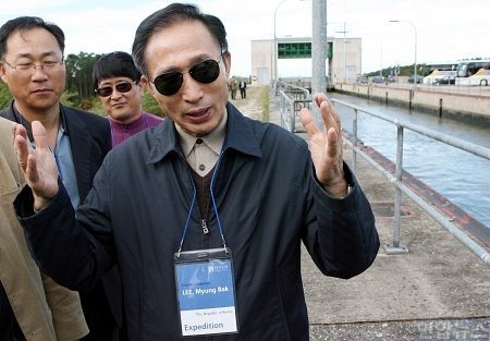 | ▲ 이명박 전 서울시장이 지난 10월 독일을 방문해 라인-마인-도나우(RMD)운하를 시찰하고 있다. 그가 당시 독일 방문에서 쓴 선글라스는 "'박정희 향수'를 자극한다"는 반발을 불러 일으키기도 했다.ⓒ연합뉴스 |