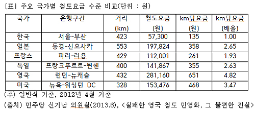 ⇨ 민주당 신기남 의원이 최근 발간한 정책 자료집, <실패한 영국 철도 민영화, 그 불편한 진실>에 따르면 2012년 서울-부산(423km) 철도 요금은 5만7300원이었습니다. 반면 영국의 런던-뉴캐슬(432km)은 28만1160원이었습니다. 영국의 철도 요금이 우리나라의 5배에 육박한 겁니다. 신 의원 자료를 토대로 각국의 km당 철도 요금을 비교해 보면 영국이 우리나라의 4.82배였고, 미국이 3.47배, 독일과 일본이 2.6배였습니다.