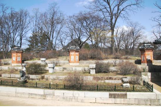 | ▲교태전 뒤편의 아미산. 삼단의 화계를 조성하고 그 위에는 나무를 심었다. Ⓒ서울학교 |