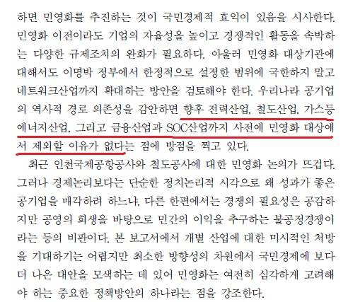 조 수석은 "본 보고서에서 개별 산업에 대한 미시적인 처방을 기대하기는 어렵지만 최소한 방향성의 차원에서 국민 경제에 보다 더 나은 대안을 모색하는 데 있어 민영화는 여전히 심각하게 고려해야 하는 중요한 정책 방안의 하나라는 점을 강조한다"고 적었다.