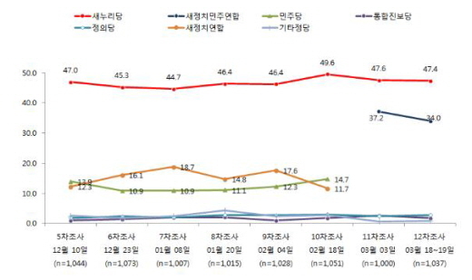 새정치민주연합 지지도는 같은 기관의 2월 중순 조사를 기준으로 했을 때, 민주당(14.7%)과 새정치연합(11.7%)의 지지도를 단순 합산한 것보다는 7~8%포인트 높지만, 여전히 1위 새누리당과는 13.4%포인트 차다.