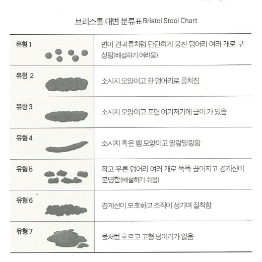 나는 평생, 적어도 내가 기억하는 한, 변비를 경험해 본 적이 없다. 320쪽에 실린 브리스톨 대변 분류표에 따르면 변비를 경험하는 사람은 대게 유형 1의 변을 보시는가 보다. 저자는 유형 2와 5 사이가 가장 적당하고 하루에 한두 번 배변하는 게 이상적이라고 했지만, 나는 대학 입학 후 줄곧 유형 6과 7의 변을 하루에 4~5번 정도 본다. 행복하다. 변비만 아니면 됐지 이상적인 '똥'이라는 게 어디에 있겠는가?