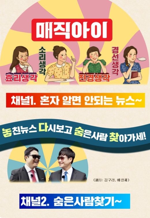 이효리를 필두로 홍진경, 문소리, 임경선을 메인 MC로, 김구라와 배성재 아나운서를 야외 코너 MC로 섭외한 <매직아이>는 ‘혼자 알면 안 되는 뉴스’를 공유하고, 우리가 미처 몰랐던 ‘숨은 사람 찾기’ 등 두 가지 코너로 구성돼 있다. 연예인들의 신변잡기식 토크쇼가 아니라 뉴스를 주제로 놓고 그에 대해 얘기를 나누는, 교양과 예능이 적절히 섞인 프로그램이라는 점에서 신선한 출발을 예고했다.