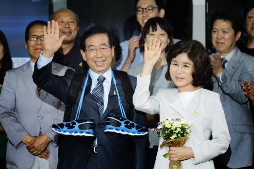 ▲재선에 성공한 박원순 서울시장이 부인 강난희 씨와 함께 지지자들의 환호에 손을 흔들어 답하고 있다. 박 시장의 목에 걸린 것은 당선 축하 선물로 받은 운동화. ⓒ프레시안(최형락)