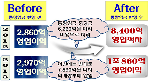1년 사이에 냉탕과 온탕을 오가고, 천국과 지옥을 넘나들게 한 것은 바로 '통상임금 회계 처리'이다. 만일 2013년 역시 통상임금 소송을 회계 처리에 반영하지 않았다면 어떻게 되었을까? 위에 나타난 산술식처럼 2970억의 영업 이익을 기록했을 것이다.