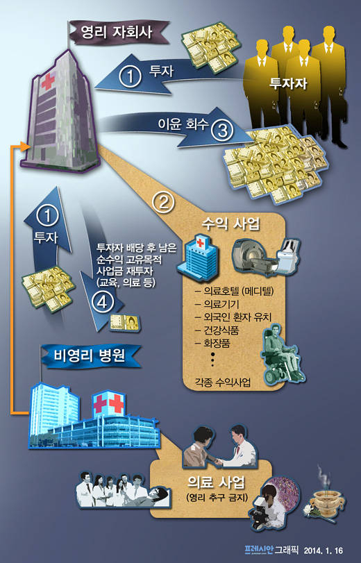 우선 첫째로 영리 자회사 설립 가이드라인. 지금까지 한국의 법인병원은 투자자에게 수익을 배분하게 할 수는 없게 한다는 뜻에서 '비영리'로 규제되어왔다. 그런데 앞으로는 이 비영리병원이 영리 자회사를 만들어 외부 투자자의 투자를 받고 이윤 배분을 한다. '엄마' 병원은 비영리, '아들' 병원회사는 영리 주식회사가 되는 것이다.