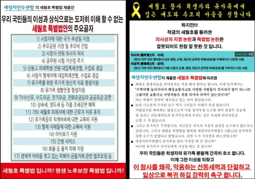 세월호특별법의 핵심이 사고 진상규명이 아닌 유족들에 대한 배상·보상·지원 문제인 것처럼 호도하는 여론 공작이 전방위적으로 펼쳐지고 있다는 주장이 나왔다. <문화일보> 광고에 이어, 이번에는 지하철역 등에서 살포된 전단지에 이같은 내용이 담겼다는 것.
