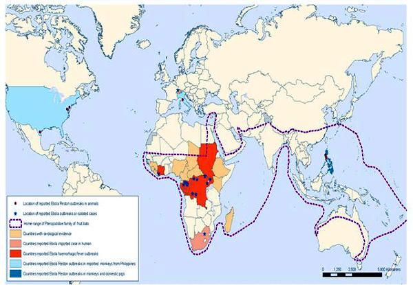 1976년 아프리카 콩고공화국에서 최초 발생한 이후, 가봉, 코트디부아르, 수단, 우간다 등에서 발생하였으며, 2014년에 서아프리카 3개국에서 감염자 및 사망자가 지속적으로 발생하고 있다.