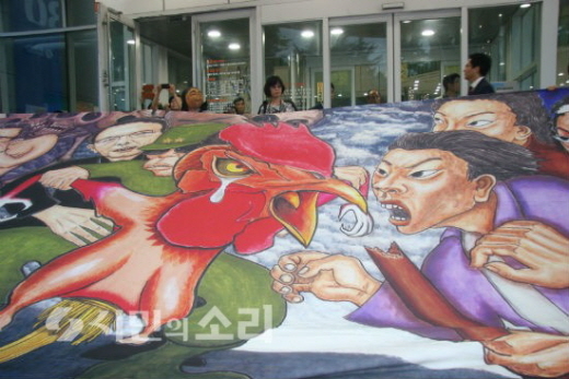 본래 이 걸개그림은 8일 오후 5시 시립미술관 로비에 전시될 예정이었다. 하지만 30분이 지나고, 1시간이 지나도 전혀 전시될 기미를 보이지 않았다.