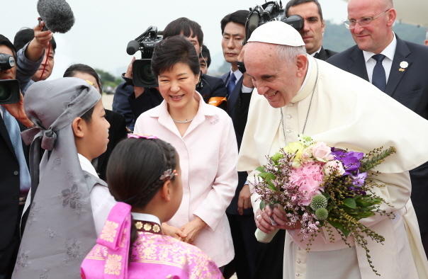 프란치스코 교황이 14일 한국 땅을 밟았습니다. 종교를 떠나 우리 사회가 교황의 방한에 각별한 의미를 부여하는 까닭은 그가 거대한 종교 조직의 지도자이기 때문만은 아닙니다. 그가 몸소 실천한 겸손과 포용의 낮은 자세, 약자와 빈자에게 먼저 손을 내미는 영적인 진정성에 대한 기대 때문일 겁니다. 방한 중 교황은 세월호 참사 생존자와 유족들, 밀양 송전탑 건설 반대 주민, 위안부 피해 할머니들, 용산 참사 유가족들, 제주 강정마을 주민들, 쌍용차 해고 노동자들을 두루 만날 예정입니다. 모두 우리 사회의 가장 아픈 곳이자 정치가 외면한 낮은 곳입니다. 부디 고통 받는 그들이 교황과의 만남에서 치유를 받고 용기와 희망을 얻기를 바라마지 않습니다.