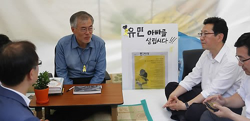 제가 광화문 광장에서 단식을 한지 6일이 됐습니다. 유민아빠 김영오씨의 단식을 말리기 위한 일입니다. 하지만 그의 목숨을 건 단식은 병원에서도 계속되고 있습니다. 한편으로 대통령 면담을 요구하는 유족들이 청와대 앞 노상에서 이틀째 밤을 지새웠습니다.