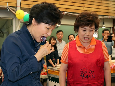 이날 오후 서울 답십리의 현대시장을 방문한 박 대통령은 온누리상품권으로 떡과 채소, 생선, 과일 등을 구입하며 상인들과 덕담을 나눴다. 박 대통령의 전통시장 방문은 추석을 앞두고 벌여온 민생 행보의 연장선으로 풀이된다.