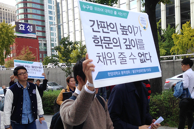 <중앙>으로부터 올해 호평을 받은 동국대 재학생 정원빈 총학생회장은 6일 중앙일보 사옥 앞에서 열린 규탄 기자회견에서 "동국대는 오늘 역대 최고 성적인 11위에 올랐다. 국제화 부문이 상승한 결과"라며 "그러나 무분별하게 영어강의를 증설해 학생들은 모국어로 공부하기도 힘든데도 영어 강의를 듣고 있다"고 했다. <중앙>이 내민 평가 기준과 학생들의 평가 기준이 다름을 지적한 것이다.