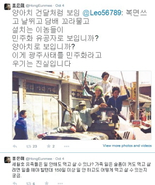 5.18 광주민주화 운동에 대해 한 누리꾼이 "5.18은 시민들이 무기고를 습격해 총을 탈취하고 군용차를 탈취해 총을 서로 쏴댔다"고 왜곡된 주장을 한 데 대해서도 "이게 민주화 운동?"이라며 공감을 표했다. 한 케이블방송이 '5.18 이후 조선노동당 대남부서 인사들이 훈장을 받았다'는 주장을 보도한 데 대해서도 "사실이라면 의심할 만하다"고 했다.