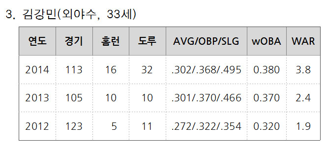 다만 최근 몇 년간 크고 작은 부상에 시달렸다는 점은 체크해볼 필요가 있다. 통산 몸에 맞는 볼 156개로 역대 3위(1위 박경완, 2위 박종호)에 올라있다는 것도 선수 생명을 놓고 보면 긍정적인 요인은 아니다.