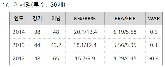 투수 성적은 경기 수, 투구이닝, 타석당 탈삼진 비율/타석당 볼넷 비율, 평균자책점(ERA)/수비무관평균자책점(kFIP), 대체선수대비승리기여도(WAR) 순으로 표기했다. kFIP는 수비수의 영향을 받는 피안타, 자책점 등을 제외하고 홈런, 탈삼진, 볼넷 등 투수 개인이 통제할 수 있는 요소만을 반영해 평균자책점의 형태로 나타낸 통계수치다.