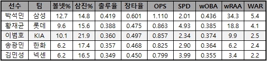[이상] 삼성 최형우는 외야수 중 가장 높은 장타율(0.649)을 기록하면서도 삼진 당하는 비율은 12.6%로 팀 동료 박한이(13%)보다도 낮았다. 대개 홈런과 삼진이 비례한다는 점을 떠올리면, 올해 최형우는 가장 이상적인 타자에 가까운 모습이었다. 롯데 손아섭은 많은 볼넷과 적은 삼진을 기록하며 4할대 출루율-5할대 장타율을 기록했다. 대체선수대비승수(WAR)는 외야수 중 가장 많은 6.7승을 기록했는데, 올해 롯데의 팀 성적을 고려하면 손아섭의 팀 내 비중은 절대적이다. NC 나성범은 볼넷/삼진 비율은 다소 떨어지지만 높은 장타율과 주루능력(SPD 6.68)으로 리그 중견수 중 최고의 성적을 냈다. 역대 프로야구 중견수 중 30홈런을 쳐낸 선수는 박재홍과 이병규(9번), 데이비스 이후로는 나성범이 처음이다. 이택근, 박용택, 이병규(7번), 김강민도 좋은 시즌을 보내긴 했지만 손아섭-최형우-나성범 3인방과 비교할 수준은 아니다.